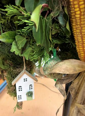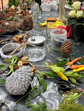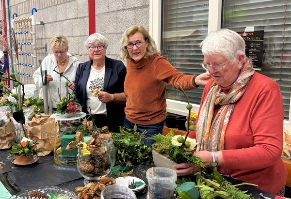 De bloemschiktafel met alle bloemen, takken, mos, dennenappels en diverse schalen, flesjes, schotels, potjes en vazen stonden al klaar. We gingen direct aan het schikken. Alle reeds thuis gemaakte kleine en grote bloementaarten werden voorzien van een prijsje en uitgestald.